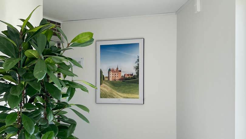 Sygeplejerske Tina Gaarde Jensen ved sit personlige yndlingsmotiv: “Rapsmark ved Ulriksholm Slot”. Tina bruger Sonovisions store landskabsfotos i sit arbejde med at formidle værdifulde samtaler med plejehjemmets beboere.